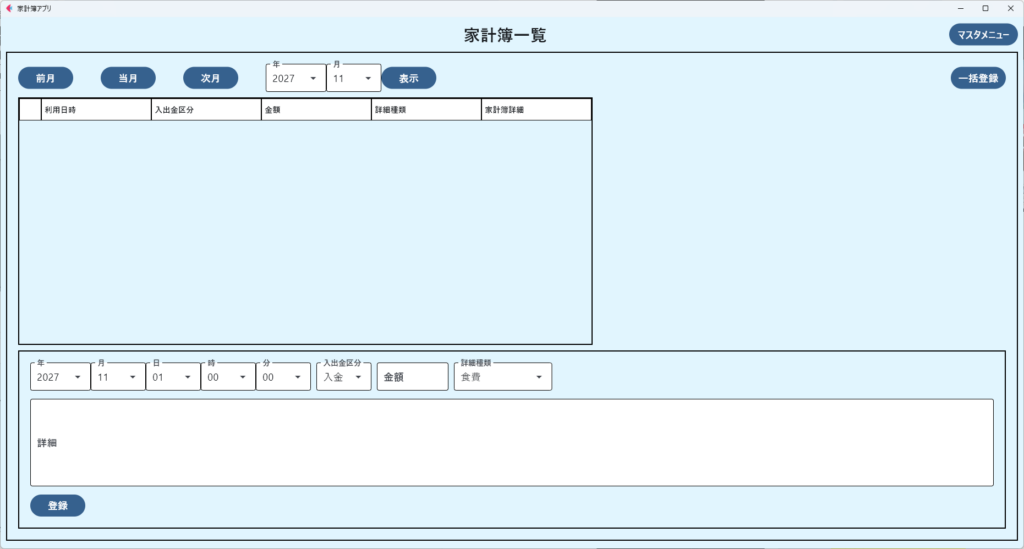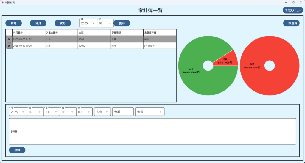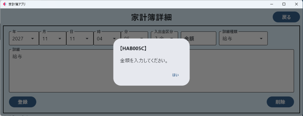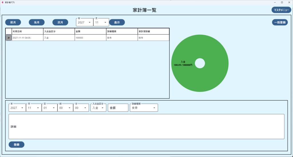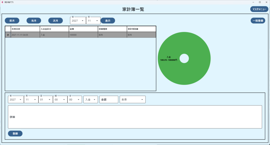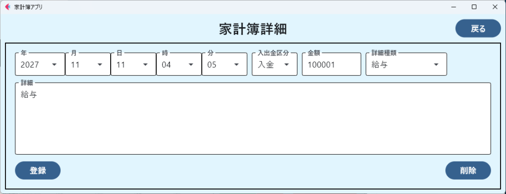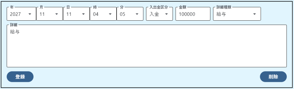 年、月、日、時、分、入出金区分、金額、詳細種類、詳細を入力し、登録ボタンを押して登録する