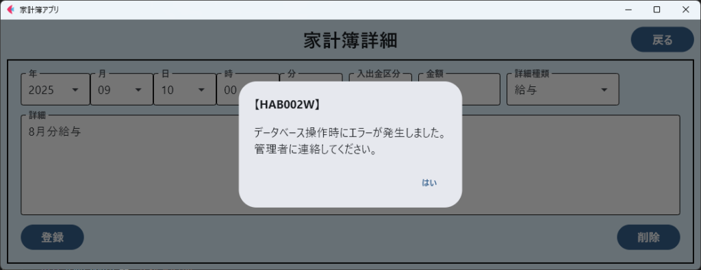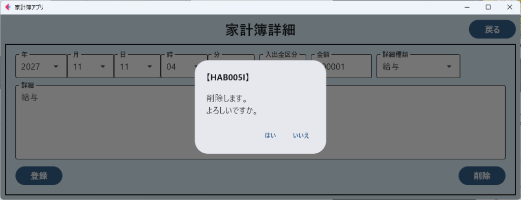 # 家計簿詳細アダプターを使用し、論理削除を行う