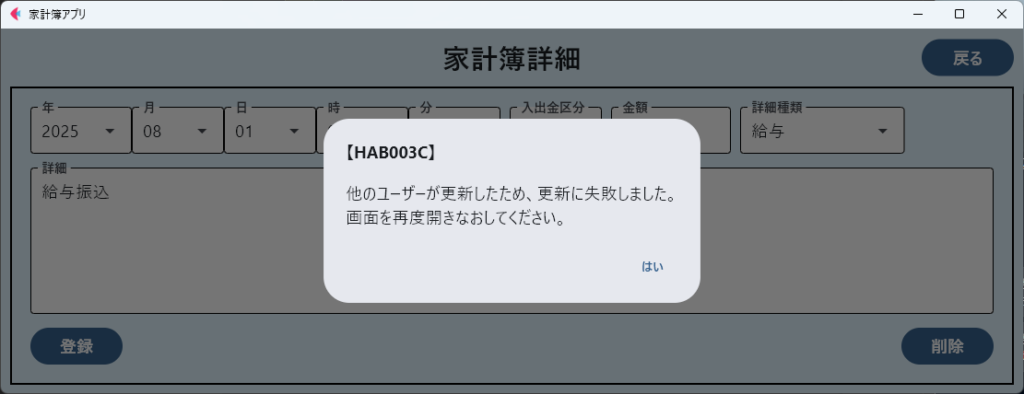 「他のユーザーが更新したため、更新に失敗しました。画面を再度開きなおしてください。」とエラーメッセージを表示する